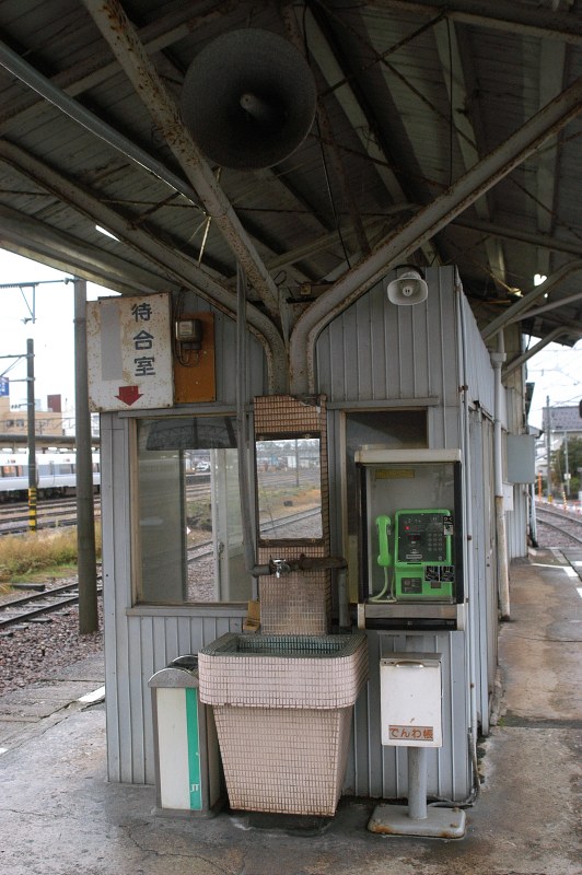 右は新魚津駅(地鉄)ホームの、時代がかった洗面台