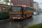 桜橋を渡る…旧塗装の市内電車はともかく…日野RV、今なお現役(^^;
